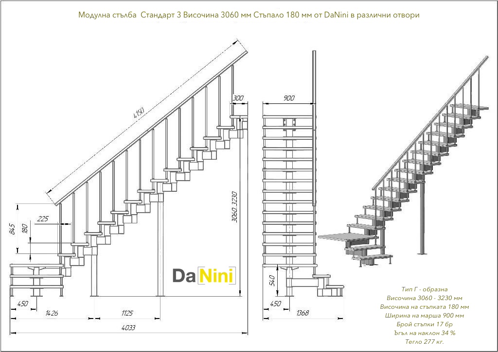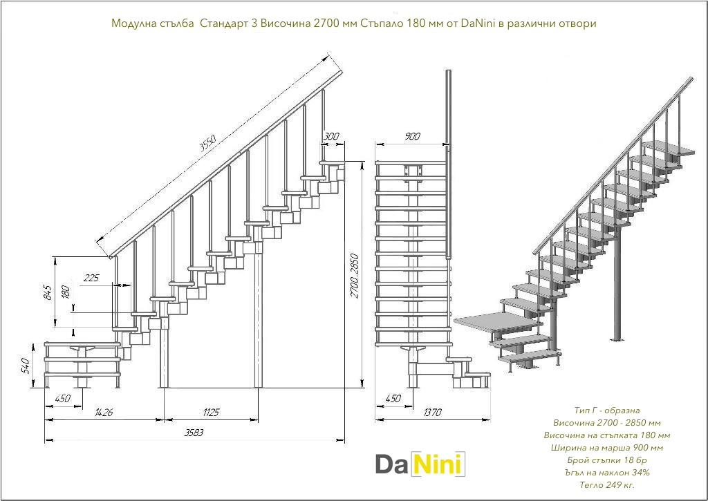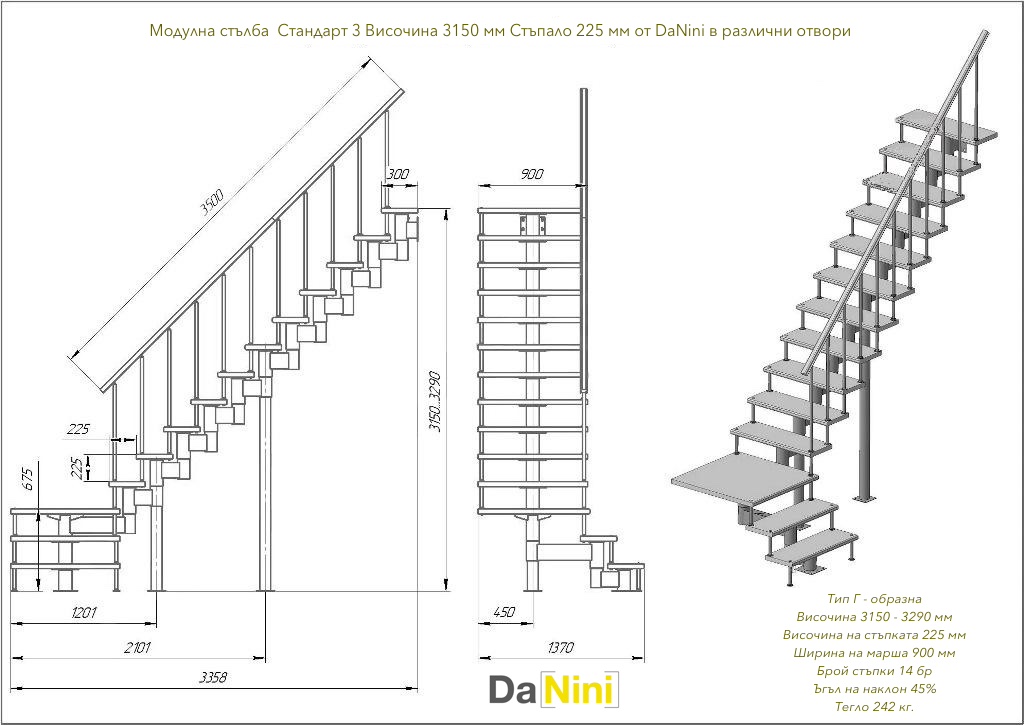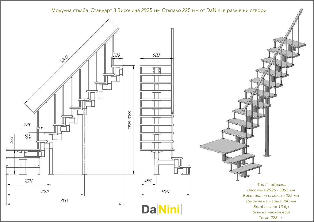 Характеристики за модулна стълба Стандарт 3 за модели с стъпка 225 и 180 мм.